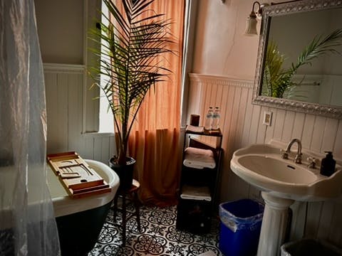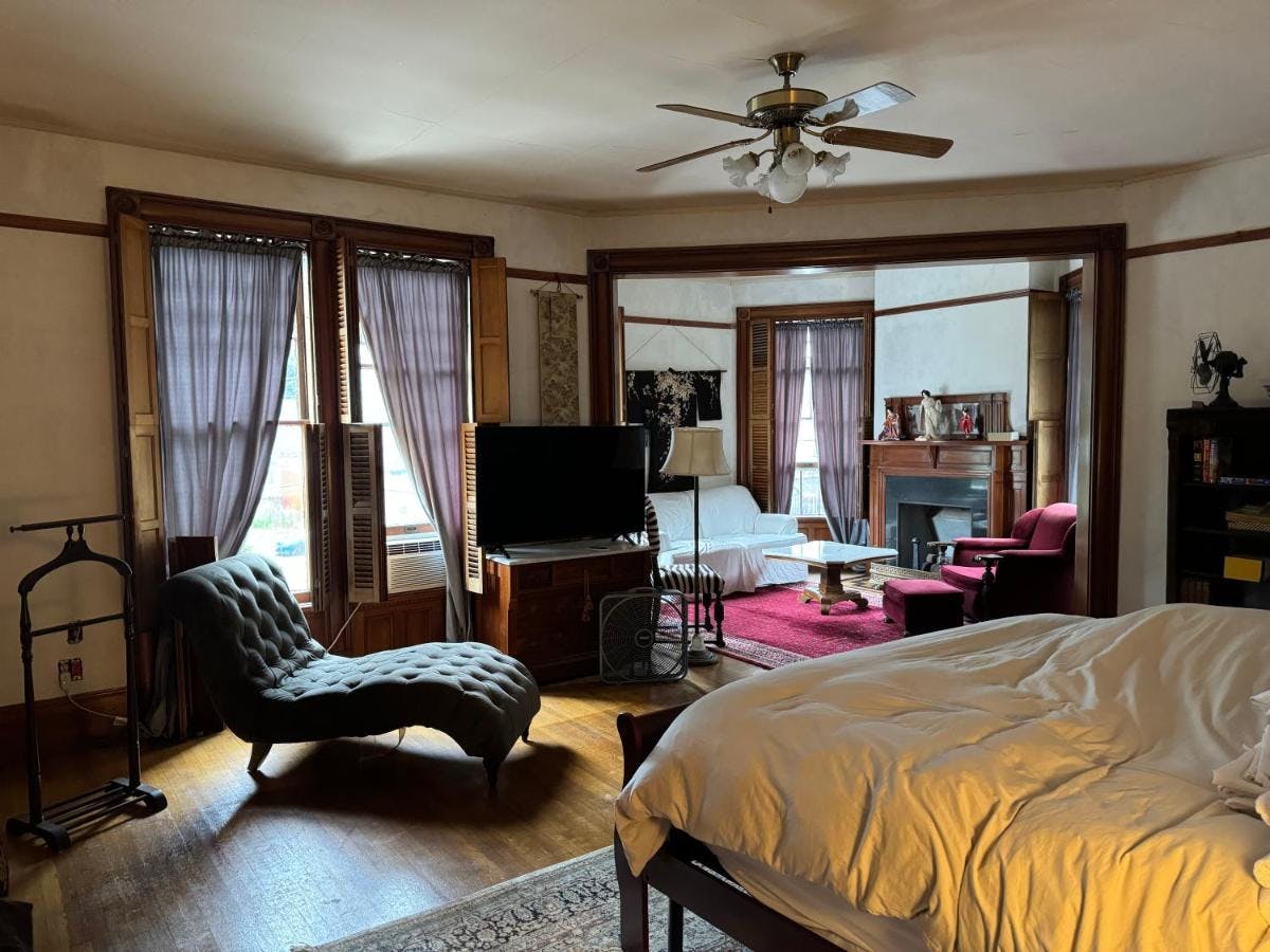 The King Suite, which offers ample space, includes air conditioning, a seating area, king bed, wardrobe, and a private bathroom across the hall. That hallway has limited access, so you will enjoy privacy.